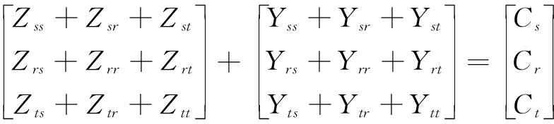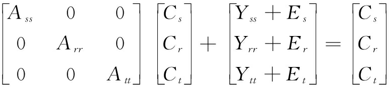 表1中,下标s、r、t分别表示S国、R国和T国,Z代表中间产品投入矩阵,Y代表最终产品使用矩阵,VA为增加值行向量,C代表总产出列向量,上标“’”表示矩阵转置,Zsr、Ysr、VAs、Cs分别表示S国出口产品中被R国用作中间产品、最终使用部分、S国的增加值和产出。从一国投入产出的使用方向看,存在以下平衡式: