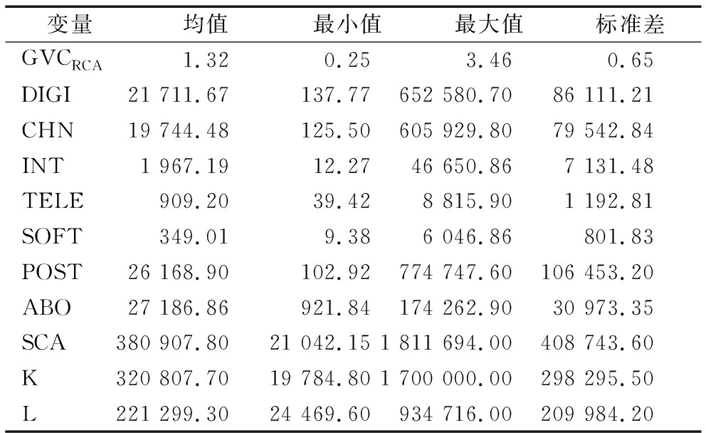 变量均值最小值最大值标准差GVCRCA1.320.253.460.65DIGI21 711.67137.77652 580.7086 111.21CHN19 744.48125.50605 929.8079 542.84INT1 967.1912.2746 650.867 131.48TELE909.2039.428 815.901 192.81SOFT349.019.386 046.86801.83POST26 168.90102.92774 747.60106 453.20ABO27 186.86921.84174 262.9030 973.35SCA380 907.8021 042.151 811 694.00408 743.60K320 807.7019 784.801 700 000.00298 295.50L221 299.3024 469.60934 716.00209 984.20
