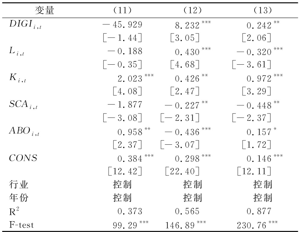 变量(11)(12)(13)DIGIi,t-45.9298.232***0.242**[-1.44][3.05][2.06]Li,t-0.1880.430***-0.320***[-0.35][4.68][-3.61]Ki,t2.023***0.426**0.972***[4.08][2.47][3.29]SCAi,t-1.877-0.227**-0.448**[-3.08][-2.31][-2.37]ABOi,t0.958**-0.436***0.157*[2.37][-3.07][1.72]CONS0.384***0.298***0.146***[12.42][22.40][12.11]行业控制控制控制年份控制控制控制R20.3730.5650.877F-test99.29***146.89***230.76***
