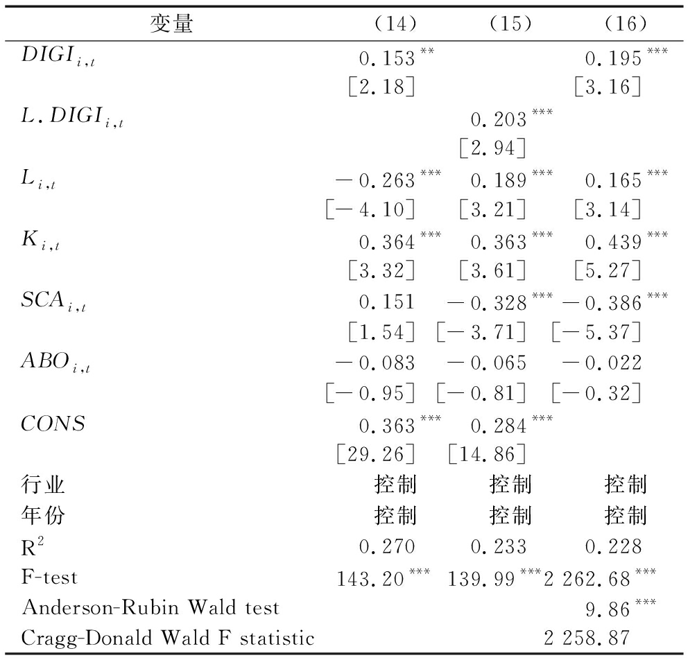 变量(14)(15)(16)DIGIi,t0.153**0.195***[2.18][3.16]L.DIGIi,t0.203***[2.94]Li,t-0.263***0.189***0.165***[-4.10][3.21][3.14]Ki,t0.364***0.363***0.439***[3.32][3.61][5.27]SCAi,t0.151-0.328***-0.386***[1.54][-3.71][-5.37]ABOi,t-0.083-0.065-0.022[-0.95][-0.81][-0.32]CONS0.363***0.284***[29.26][14.86]行业控制控制控制年份控制控制控制R20.2700.2330.228F-test143.20***139.99***2 262.68***Anderson-Rubin Wald test9.86***Cragg-Donald Wald F statistic2 258.87