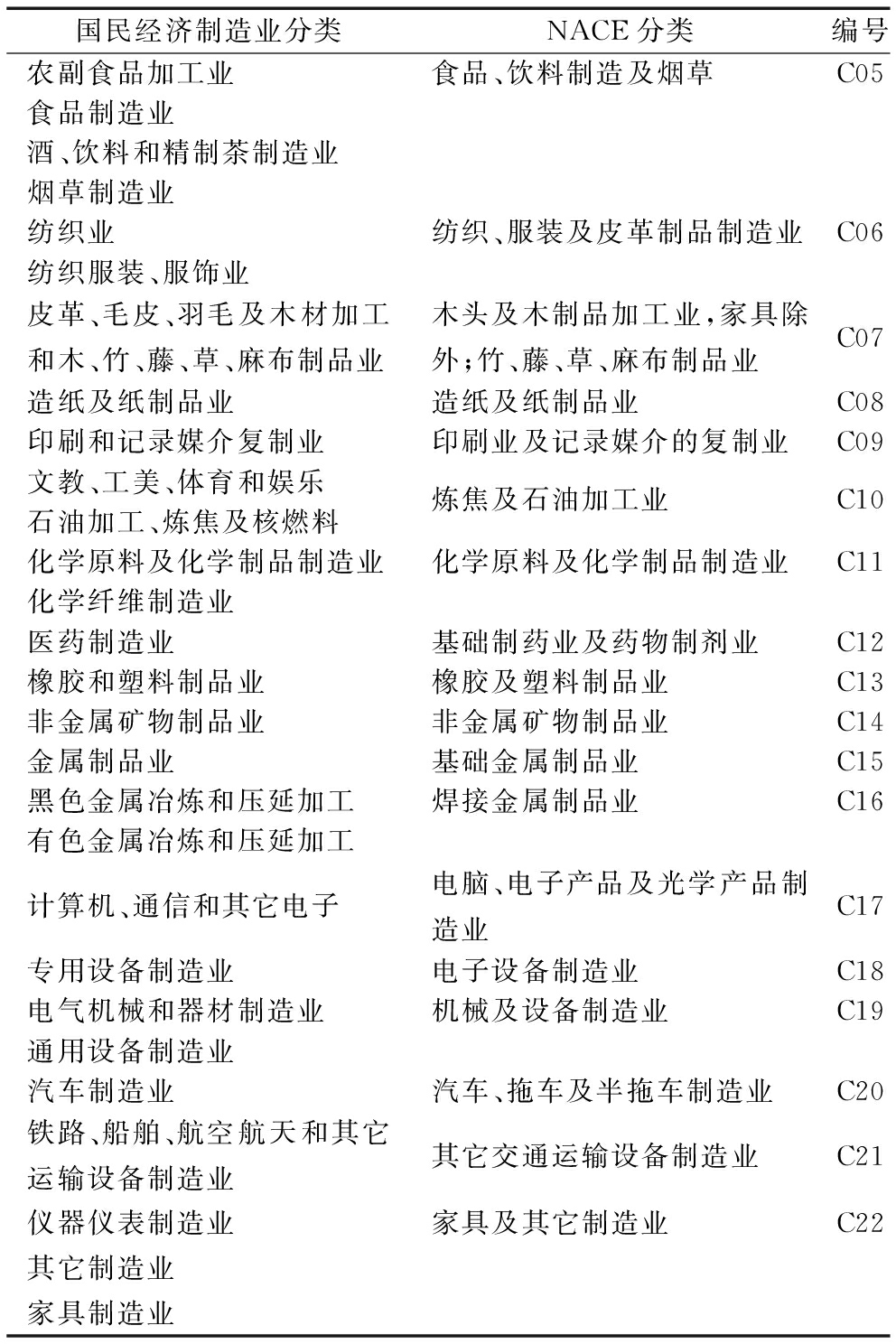 国民经济制造业分类NACE分类编号农副食品加工业食品、饮料制造及烟草C05食品制造业酒、饮料和精制茶制造业烟草制造业纺织业纺织、服装及皮革制品制造业C06纺织服装、服饰业皮革、毛皮、羽毛及木材加工和木、竹、藤、草、麻布制品业木头及木制品加工业,家具除外;竹、藤、草、麻布制品业C07造纸及纸制品业造纸及纸制品业C08印刷和记录媒介复制业印刷业及记录媒介的复制业C09文教、工美、体育和娱乐石油加工、炼焦及核燃料炼焦及石油加工业C10化学原料及化学制品制造业化学原料及化学制品制造业C11化学纤维制造业医药制造业基础制药业及药物制剂业C12橡胶和塑料制品业橡胶及塑料制品业C13非金属矿物制品业非金属矿物制品业C14金属制品业基础金属制品业C15黑色金属冶炼和压延加工焊接金属制品业C16有色金属冶炼和压延加工计算机、通信和其它电子电脑、电子产品及光学产品制造业C17专用设备制造业电子设备制造业C18电气机械和器材制造业机械及设备制造业C19通用设备制造业汽车制造业汽车、拖车及半拖车制造业C20铁路、船舶、航空航天和其它运输设备制造业其它交通运输设备制造业C21仪器仪表制造业家具及其它制造业C22其它制造业家具制造业