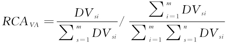 在基于投入产出模型的贸易增加值核算中,很自然地会涉及一国显性比较优势(Revealed Comparative Advantage,RCA)指数的核算。RCA指数反映一国某产业比较优势与竞争优势形成的实际结果,是衡量产业GVC竞争力(优势)的重要指标之一。RCA指数等于一国某产业产品出口值占该国全部出口产品总值的比例除以全球该产业产品出口值占全球产品出口总值的比例。王直等[15]基于WWZ法,综合考虑出口的国内和国际生产分工,排除总出口中的纯重复计算和国外增加值部分,对传统RCA指数进行修正。