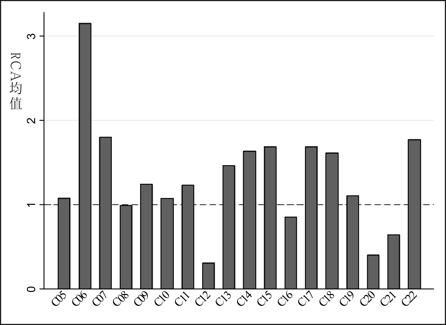 Fig.3 Average value of RCA index of China's manufacturing subsectors