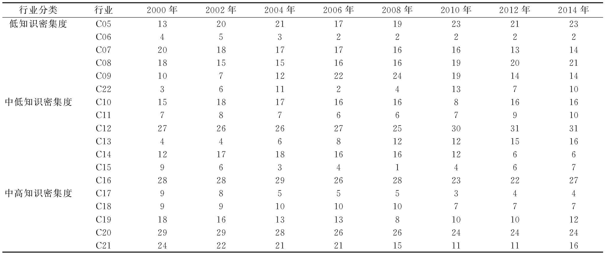 行业分类行业2000年2002年2004年2006年2008年2010年2012年2014年低知识密集度C051320211719232123C0645322222C072018171716161314C081815151616192021C09107122224191414C2236112413710中低知识密集度C10151817161681616C11787667910C122726262725303131C13446812121516C1412171816161266C1596341467C162828292628232227中高知识密集度C1798555344C1899101010777C19181613138101012C202929282626242424C212422212115111116