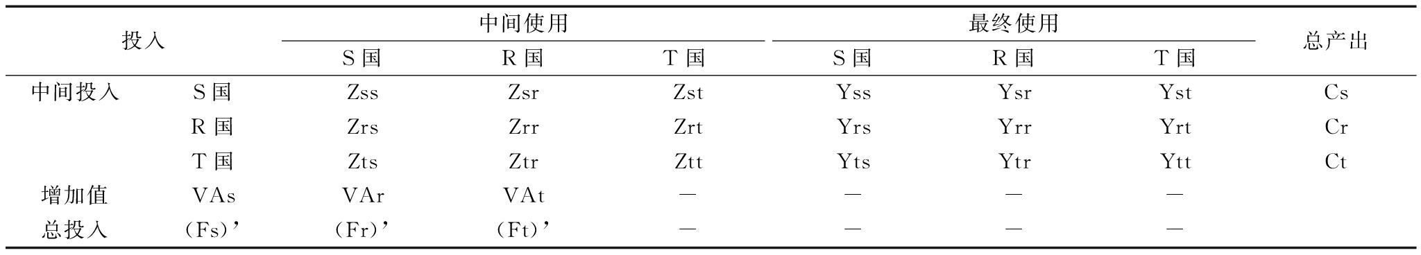 投入中间使用S国R国T国最终使用S国R国T国总产出中间投入S国ZssZsrZstYssYsrYstCsR国ZrsZrrZrtYrsYrrYrtCrT国ZtsZtrZttYtsYtrYttCt增加值VAsVArVAt----总投入(Fs)’(Fr)’(Ft)’----