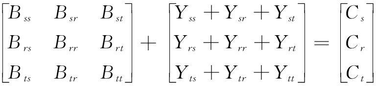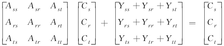 Esr=AsrCr+Ysr=(VsBss)'Ysr+(VsBrs)'Ysr+(VtBts)'Ysr+(VsBss)'(AsrCr)+(VrBrs)'(AsrCr)+(VtBts)'(AsrCr)=(VsBss)'Ysr+(VsLss)'(AsrBrrYrr)+(VsLss)'(AsrBrtYtt)+(VsLss)'(AsrBrrYrt)+(VsLss)'(AsrBrtYtr)+(VsLss)'(AsrBrrYrs)+(VsLss)'(AsrBrtYts)+(VsLss)'(AsrBrsYss)+(VsLss)'[AsrBrs(Yrr+Yst)]+(VsBss-VsLss)'(AsrXr)+(VsBrs)'Ysr+(VrBrs)'(AsrBrrYrr)+(VrLrs)'(AsrBrrEr)+(VtBts)'Ysr+(VtBts)'(AsrLrrYrr)+(VsBts)'(AsrLrrEr)