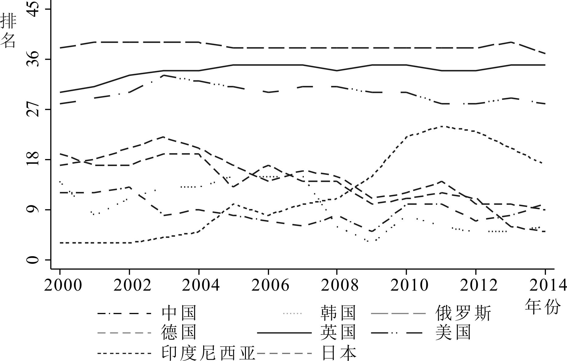 图2为中国与世界其它主要经济体(美国、日本、德国、英国、俄罗斯、韩国、印度尼西亚)制造业RCA指数的横向比较情况。由图2可知,中国制造业RCA指数排名位居前列,其中2002—2007年RCA排名稳步增长,表明中国制造业国际竞争力稳健提升;2008—2014年中国RCA排名出现波动性下降,该阶段,印度尼西亚、日本、德国和韩国的RCA指数排名显著提高,说明在后金融危机时代,发达国家引资回流、产业转移以及其它发展中国家工业化兴起弱化了中国制造业的GVC竞争优势。此外,从RCA指数排名可以发现,美国、俄罗斯、英国的制造业空心化严重,中国、日本、德国、韩国的制造业竞争优势明显。