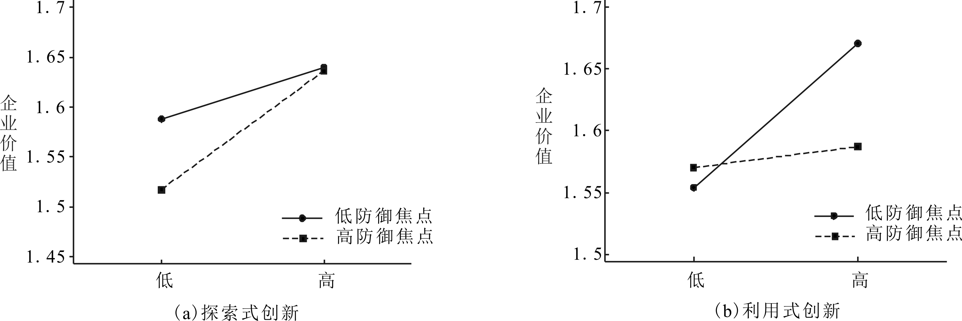 为了更加直观地揭示领导者调节焦点在双元创新与企业价值间的调节作用,本文以领导者调节焦点均值加减一个标准差后的值作为高调节焦点和低调节焦点,以此绘制调节效应图,如图2和图3所示。由图2可以看出,领导者促进焦点显著削弱企业探索式创新和利用式创新对企业价值的促进作用,甚至导致在领导者高促进焦点的作用下,利用式创新无益于企业价值,H2a进一步得到验证,H2b再次被拒绝。同样地,由图3(a)可以看出,相对于领导者低防御焦点,领导者高防御焦点下,探索式创新对企业价值的积极影响更显著,H3a得到验证。从图3(b)可以看出,领导者防御焦点会抑制利用式创新对企业价值的积极作用,H3b同样再次得到支持。