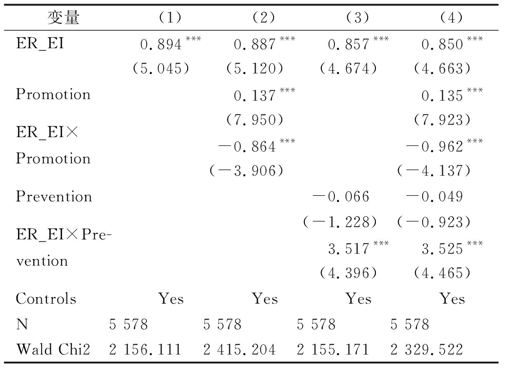 变量(1)(2)(3)(4)ER_EI0.894***0.887***0.857***0.850***(5.045)(5.120)(4.674)(4.663)Promotion0.137***0.135***(7.950)(7.923)ER_EI×Promotion-0.864***-0.962***(-3.906)(-4.137)Prevention-0.066-0.049(-1.228)(-0.923)ER_EI×Pre-vention3.517***3.525***(4.396)(4.465)ControlsYesYesYesYesN5 5785 5785 5785 578Wald Chi22 156.1112 415.2042 155.1712 329.522