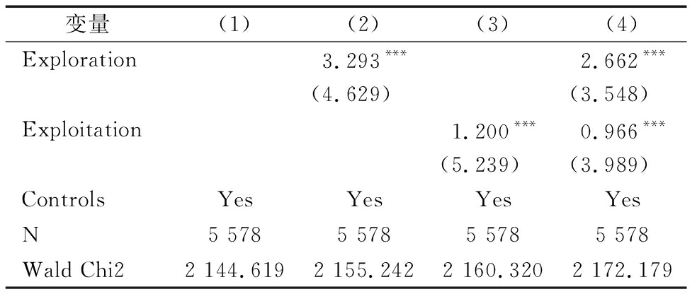 变量(1)(2)(3)(4)Exploration3.293***2.662***(4.629)(3.548)Exploitation1.200***0.966***(5.239)(3.989)ControlsYesYesYesYesN5 5785 5785 5785 578Wald Chi22 144.6192 155.2422 160.3202 172.179