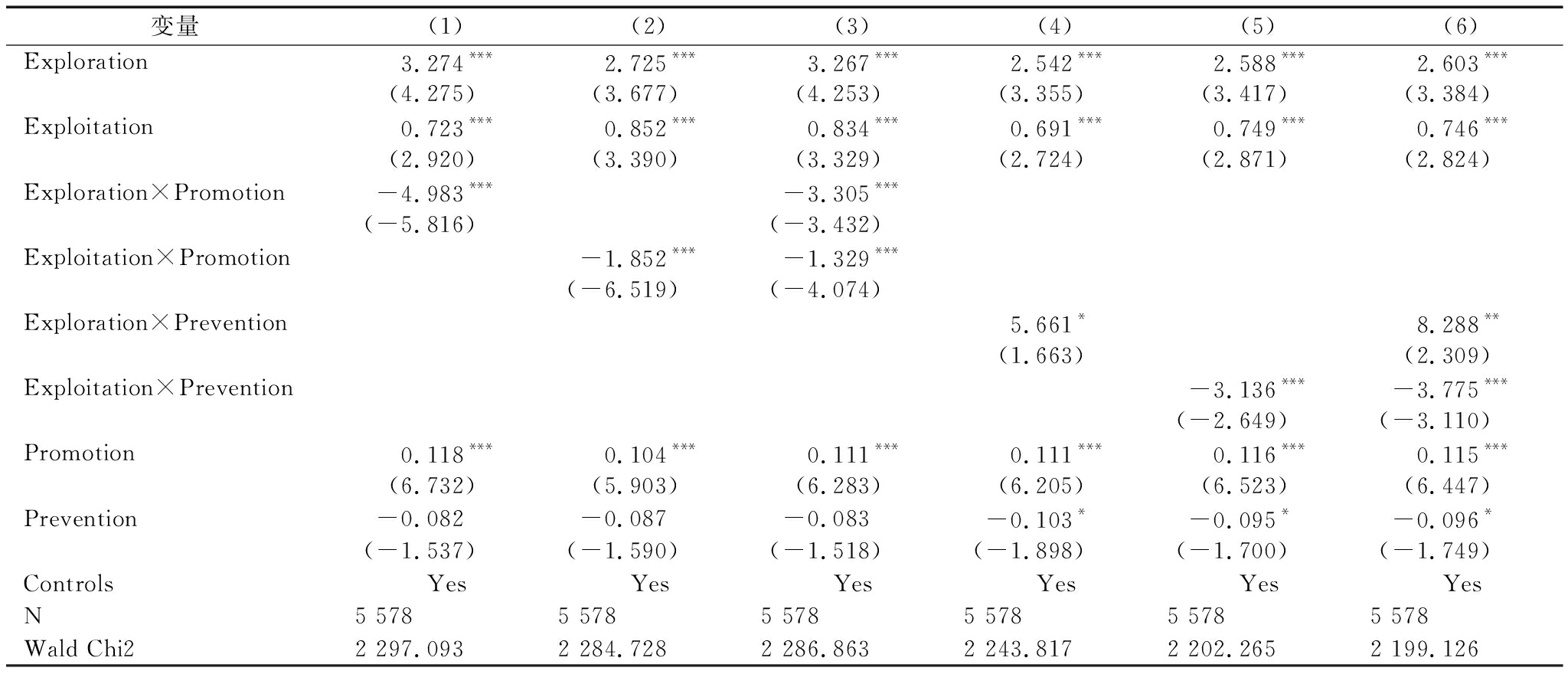 变量(1)(2)(3)(4)(5)(6)Exploration3.274***2.725***3.267***2.542***2.588***2.603***(4.275)(3.677)(4.253)(3.355)(3.417)(3.384)Exploitation0.723***0.852***0.834***0.691***0.749***0.746***(2.920)(3.390)(3.329)(2.724)(2.871)(2.824)Exploration×Promotion-4.983***-3.305***(-5.816)(-3.432)Exploitation×Promotion-1.852***-1.329***(-6.519)(-4.074)Exploration×Prevention5.661*8.288**(1.663)(2.309)Exploitation×Prevention-3.136***-3.775***(-2.649)(-3.110)Promotion0.118***0.104***0.111***0.111***0.116***0.115***(6.732)(5.903)(6.283)(6.205)(6.523)(6.447)Prevention-0.082-0.087-0.083-0.103*-0.095*-0.096*(-1.537)(-1.590)(-1.518)(-1.898)(-1.700)(-1.749)ControlsYesYesYesYesYesYesN5 5785 5785 5785 5785 5785 578Wald Chi22 297.0932 284.7282 286.8632 243.8172 202.2652 199.126