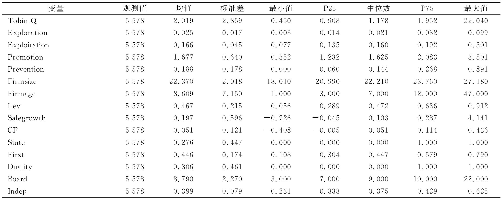 变量观测值均值标准差最小值P25中位数P75最大值Tobin Q5 5782.0192.8590.4500.9081.1781.95222.040Exploration5 5780.0250.0170.0030.0140.0210.0320.099Exploitation5 5780.1660.0450.0770.1350.1600.1920.301Promotion5 5781.6770.6400.3521.2321.6252.0833.501Prevention5 5780.1880.1780.0000.0600.1440.2680.891Firmsize5 57822.3702.01818.01020.99022.21023.76027.180Firmage5 5788.6097.1501.0003.0007.00012.00047.000Lev5 5780.4670.2150.0560.2890.4720.6360.912Salegrowth5 5780.1970.596-0.726-0.0450.1030.2874.141CF5 5780.0510.121-0.408-0.0050.0510.1140.436State5 5780.2760.4470.0000.0000.0001.0001.000First5 5780.4460.1740.1080.3040.4470.5790.790Duality5 5780.3060.4610.0000.0000.0001.0001.000Board5 5788.7902.2703.0007.0009.00010.00022.000Indep5 5780.3990.0790.2310.3330.3750.4290.625