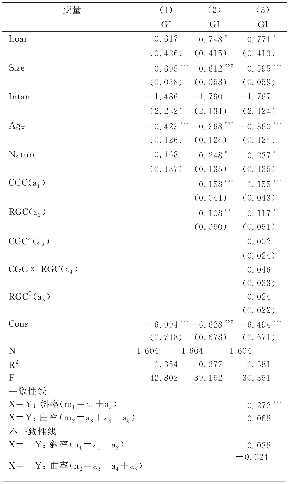 变量(1)(2)(3)(4)GIGIGIGILoar0.6170.780*0.6070.595(0.426)(0.418)(0.423)(0.420)Size0.695***0.645***0.702***0.651***(0.058)(0.057)(0.061)(0.058)Intan-1.486-1.647-1.413-1.668(2.232)(2.140)(2.236)(2.218)Age-0.423***-0.385***-0.427***-0.400***(0.126)(0.123)(0.125)(0.126)Nature0.1680.2230.1620.202(0.137)(0.136)(0.140)(0.135)CGC0.172***(0.041)SGC-0.020(0.054)RGC0.126**(0.050)Cons-6.994***-6.775***-7.011***-6.803***(0.718)(0.691)(0.724)(0.698)N1 6041 6041 6041 604R20.3540.3700.3540.364F42.80240.42835.58540.814