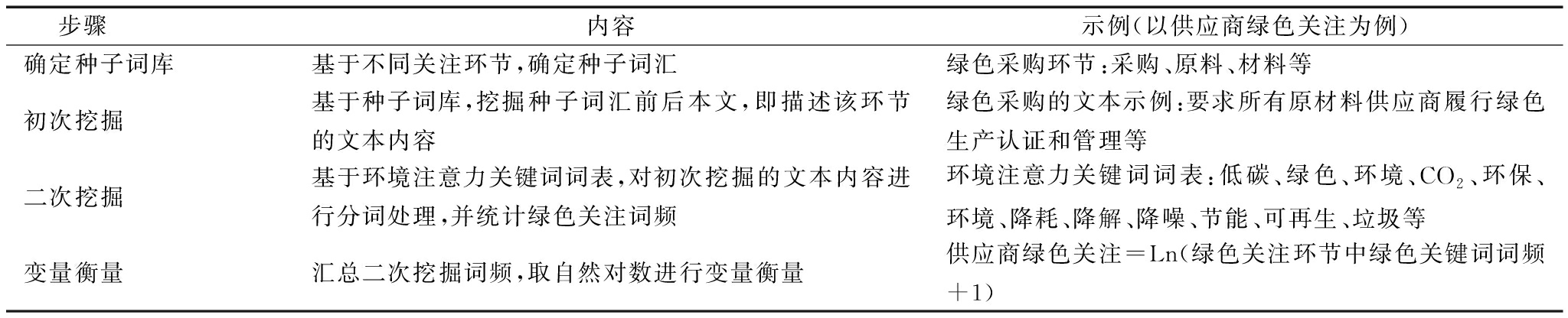 步骤内容示例(以供应商绿色关注为例)确定种子词库基于不同关注环节,确定种子词汇绿色采购环节:采购、原料、材料等初次挖掘基于种子词库,挖掘种子词汇前后本文,即描述该环节的文本内容绿色采购的文本示例:要求所有原材料供应商履行绿色生产认证和管理等二次挖掘基于环境注意力关键词词表,对初次挖掘的文本内容进行分词处理,并统计绿色关注词频环境注意力关键词词表:低碳、绿色、环境、CO2、环保、环境、降耗、降解、降噪、节能、可再生、垃圾等变量衡量汇总二次挖掘词频,取自然对数进行变量衡量供应商绿色关注=Ln(绿色关注环节中绿色关键词词频+1)