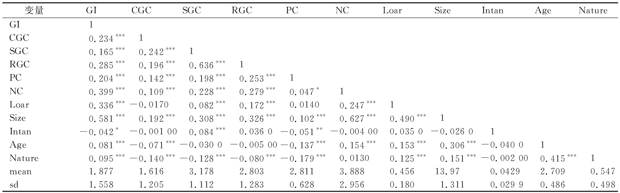 变量GICGCSGCRGCPCNCLoarSizeIntanAgeNatureGI1CGC0.234***1SGC0.165***0.242***1RGC0.285***0.196***0.636***1PC0.204***0.142***0.198***0.253***1NC0.399***0.109***0.228***0.279***0.047*1Loar0.336***-0.01700.082***0.172***0.01400.247***1Size0.581***0.192***0.308***0.326***0.102***0.627***0.490***1Intan-0.042*-0.001 000.084***0.036 0-0.051**-0.004 000.035 0-0.026 01Age0.081***-0.071***-0.030 0-0.005 00-0.137***0.154***0.153***0.306***-0.040 01Nature0.095***-0.140***-0.128***-0.080***-0.179***0.01300.125***0.151***-0.002 000.415***1mean1.8771.6163.1782.8032.8113.8880.45613.970.04292.7090.547sd1.5581.2051.1121.2830.6282.9560.1801.3110.029 90.4860.498