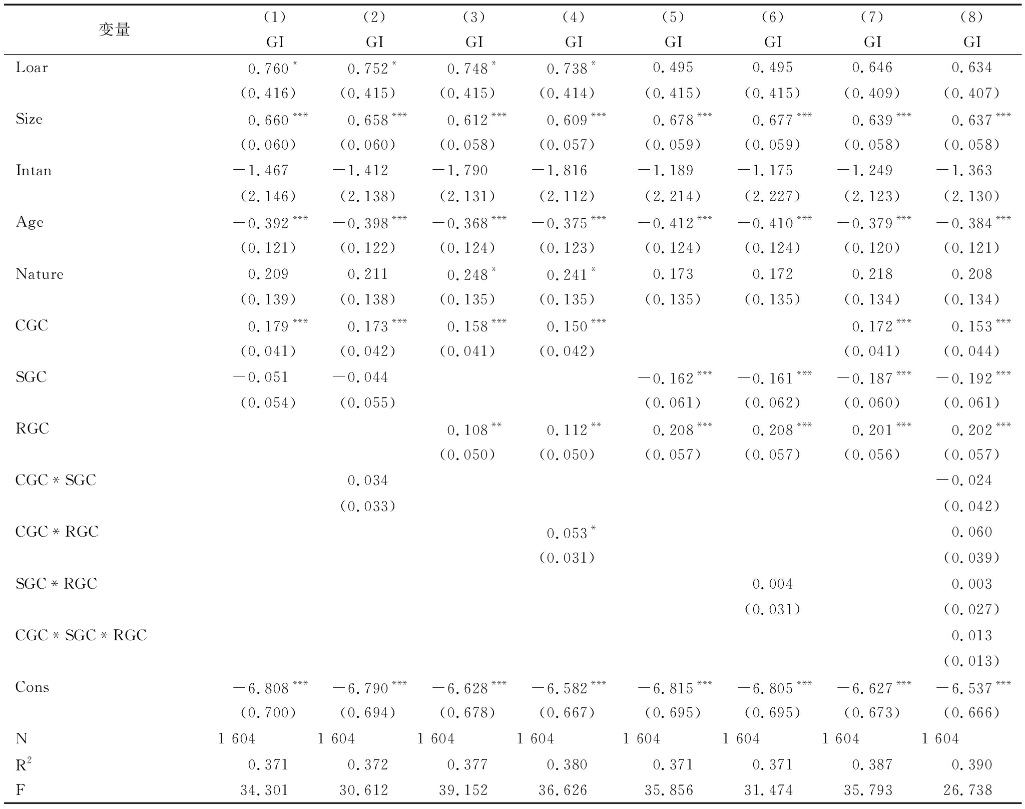 变量(1)(2)(3)(4)(5)(6)(7)(8)GIGIGIGIGIGIGIGILoar0.760*0.752*0.748*0.738*0.4950.4950.6460.634(0.416)(0.415)(0.415)(0.414)(0.415)(0.415)(0.409)(0.407)Size0.660***0.658***0.612***0.609***0.678***0.677***0.639***0.637***(0.060)(0.060)(0.058)(0.057)(0.059)(0.059)(0.058)(0.058)Intan-1.467-1.412-1.790-1.816-1.189-1.175-1.249-1.363(2.146)(2.138)(2.131)(2.112)(2.214)(2.227)(2.123)(2.130)Age-0.392***-0.398***-0.368***-0.375***-0.412***-0.410***-0.379***-0.384***(0.121)(0.122)(0.124)(0.123)(0.124)(0.124)(0.120)(0.121)Nature0.2090.2110.248*0.241*0.1730.1720.2180.208(0.139)(0.138)(0.135)(0.135)(0.135)(0.135)(0.134)(0.134)CGC0.179***0.173***0.158***0.150***0.172***0.153***(0.041)(0.042)(0.041)(0.042)(0.041)(0.044)SGC-0.051-0.044-0.162***-0.161***-0.187***-0.192***(0.054)(0.055)(0.061)(0.062)(0.060)(0.061)RGC0.108**0.112**0.208***0.208***0.201***0.202***(0.050)(0.050)(0.057)(0.057)(0.056)(0.057)CGC*SGC0.034-0.024(0.033)(0.042)CGC*RGC0.053*0.060(0.031)(0.039)SGC*RGC0.0040.003(0.031)(0.027)CGC*SGC*RGC0.013(0.013)Cons-6.808***-6.790***-6.628***-6.582***-6.815***-6.805***-6.627***-6.537***(0.700)(0.694)(0.678)(0.667)(0.695)(0.695)(0.673)(0.666)N1 6041 6041 6041 6041 6041 6041 6041 604R20.3710.3720.3770.3800.3710.3710.3870.390F34.30130.61239.15236.62635.85631.47435.79326.738