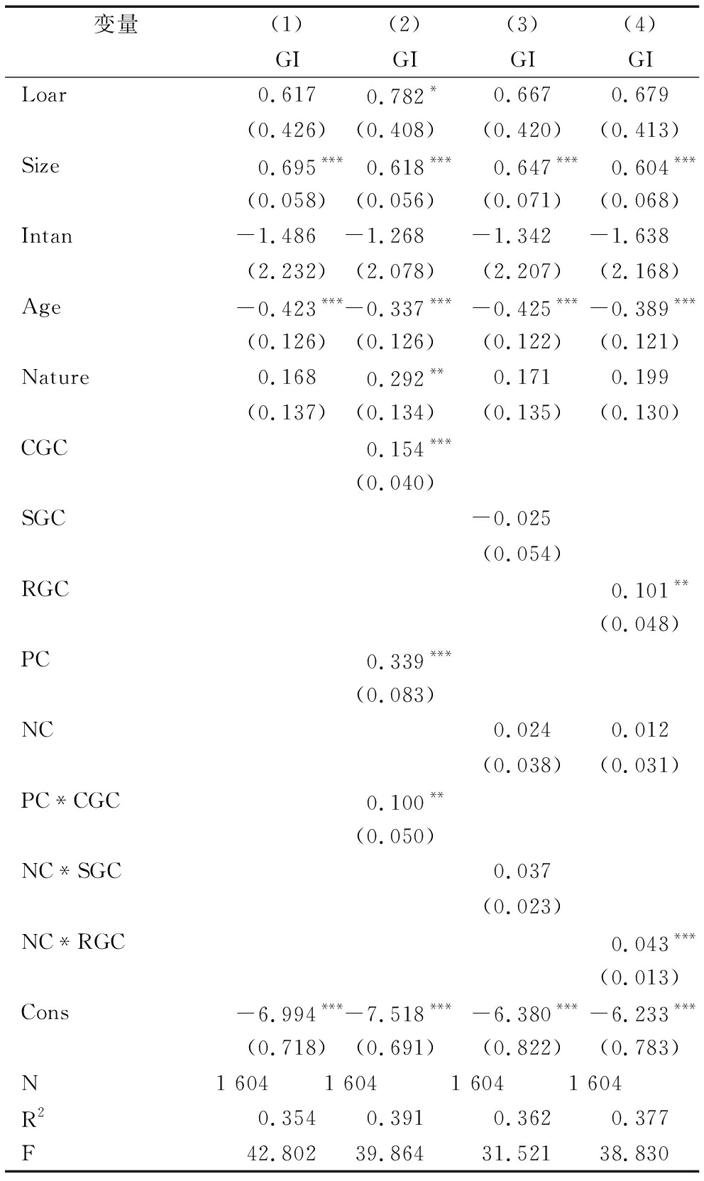 变量(1)(2)(3)(4)GIGIGIGILoar0.6170.782*0.6670.679(0.426)(0.408)(0.420)(0.413)Size0.695***0.618***0.647***0.604***(0.058)(0.056)(0.071)(0.068)Intan-1.486-1.268-1.342-1.638(2.232)(2.078)(2.207)(2.168)Age-0.423***-0.337***-0.425***-0.389***(0.126)(0.126)(0.122)(0.121)Nature0.1680.292**0.1710.199(0.137)(0.134)(0.135)(0.130)CGC0.154***(0.040)SGC-0.025(0.054)RGC0.101**(0.048)PC0.339***(0.083)NC0.0240.012(0.038)(0.031)PC*CGC0.100**(0.050)NC*SGC0.037(0.023)NC*RGC0.043***(0.013)Cons-6.994***-7.518***-6.380***-6.233***(0.718)(0.691)(0.822)(0.783)N1 6041 6041 6041 604R20.3540.3910.3620.377F42.80239.86431.52138.830