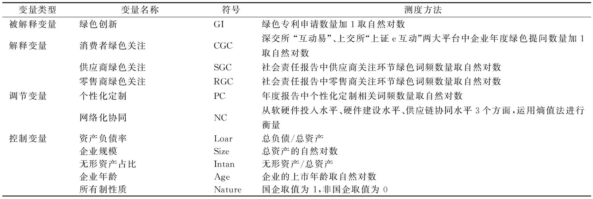 变量类型变量名称符号测度方法被解释变量绿色创新GI绿色专利申请数量加1取自然对数解释变量消费者绿色关注CGC深交所 “互动易”、上交所“上证e互动”两大平台中企业年度绿色提问数量加1取自然对数供应商绿色关注SGC社会责任报告中供应商关注环节绿色词频数量取自然对数零售商绿色关注RGC社会责任报告中零售商关注环节绿色词频数量取自然对数调节变量个性化定制PC年度报告中个性化定制相关词频数量取自然对数网络化协同NC从软硬件投入水平、硬件建设水平、供应链协同水平3个方面,运用熵值法进行衡量控制变量资产负债率Loar总负债/总资产企业规模Size总资产的自然对数无形资产占比Intan无形资产/总资产企业年龄Age企业的上市年龄取自然对数所有制性质Nature国企取值为 1,非国企取值为 0