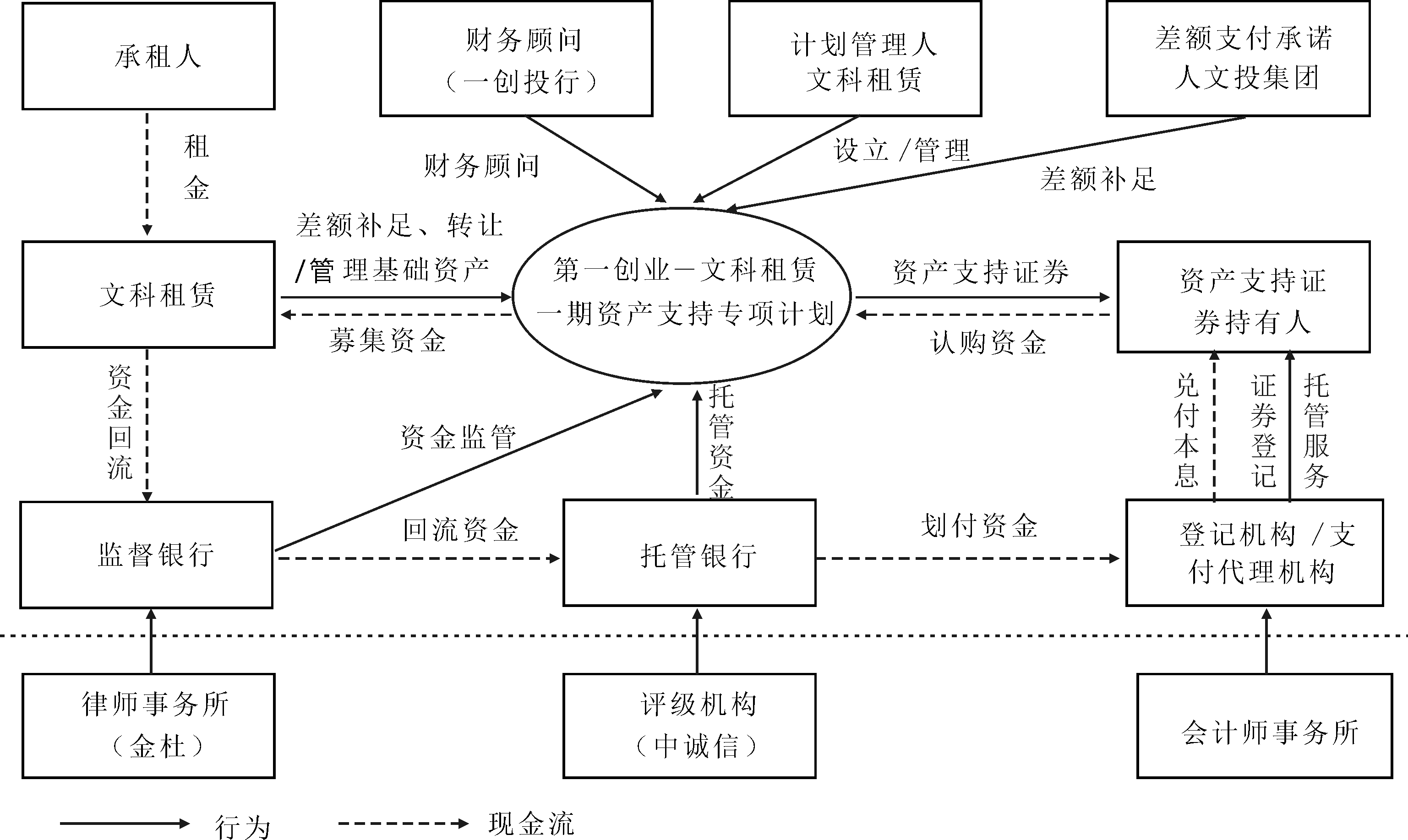 (2)未来现金计划层。根据中国企业资产证券化分析网数据,文科一期ABS合同租金本金余额为91 591.08万元,证券发行总金额为76 600万元,基础资产现金流使用超额覆盖的增信措施。此外,文科一期ABS还同时设立回收款转付机制,要求当信用评级低于AA-级时,相关方将其应支付的款项转到ABS产品专项账户。