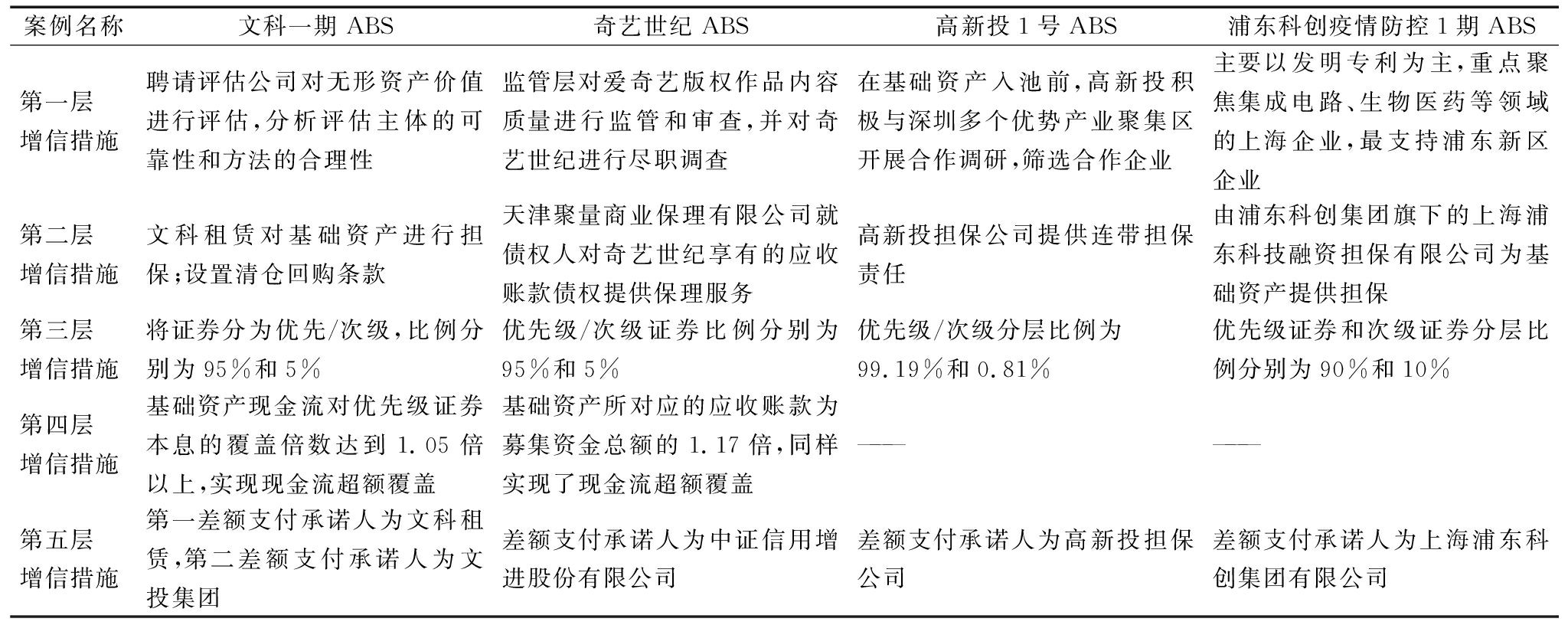 案例名称文科一期ABS奇艺世纪ABS高新投1号ABS浦东科创疫情防控1期ABS第一层增信措施聘请评估公司对无形资产价值进行评估,分析评估主体的可靠性和方法的合理性监管层对爱奇艺版权作品内容质量进行监管和审查,并对奇艺世纪进行尽职调查在基础资产入池前,高新投积极与深圳多个优势产业聚集区开展合作调研,筛选合作企业主要以发明专利为主,重点聚焦集成电路、生物医药等领域的上海企业,最支持浦东新区企业第二层增信措施文科租赁对基础资产进行担保;设置清仓回购条款天津聚量商业保理有限公司就债权人对奇艺世纪享有的应收账款债权提供保理服务高新投担保公司提供连带担保责任由浦东科创集团旗下的上海浦东科技融资担保有限公司为基础资产提供担保第三层增信措施将证券分为优先/次级,比例分别为95%和5%优先级/次级证券比例分别为95%和5%优先级/次级分层比例为99.19%和0.81%优先级证券和次级证券分层比例分别为90%和10%第四层增信措施基础资产现金流对优先级证券本息的覆盖倍数达到1.05倍以上,实现现金流超额覆盖基础资产所对应的应收账款为募集资金总额的1.17倍,同样实现了现金流超额覆盖——————第五层增信措施第一差额支付承诺人为文科租赁,第二差额支付承诺人为文投集团差额支付承诺人为中证信用增进股份有限公司差额支付承诺人为高新投担保公司差额支付承诺人为上海浦东科创集团有限公司