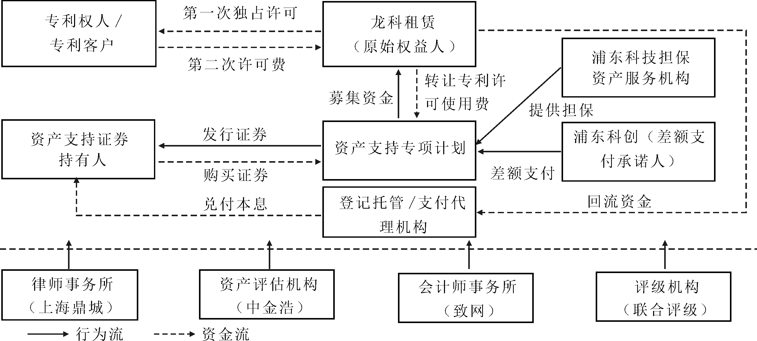 浦东科创疫情防控1期ABS原始权益人为浦创龙科,基础资产是以知识产权二次许可给原专利权人为基础形成的应收债权,由浦东科创集团旗下的上海浦东科技融资担保有限公司为基础资产提供担保。