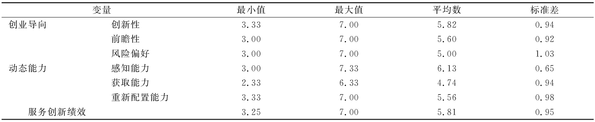 为了进一步检验各变量区分效度,本文借助Amos 24.0软件对创业导向的3个维度(创新性、前瞻性、风险偏好)、动态能力的3个维度(感知能力、获取能力与重新配置能力)与服务创新进行验证性因子分析,结果发现,七因子模型拟合效果较好。其中,1<χ2/df=2.016<3,IFI=0.931,CFI=0.929,TLI=0.911,均大于0.9,RMSEA=0.077<0.080,充分说明七因子模型能够较好地反映各变量间的因子结构。因此,各变量具有较高的区分效度。表3为条件变量与结果变量描述性统计分析结果。