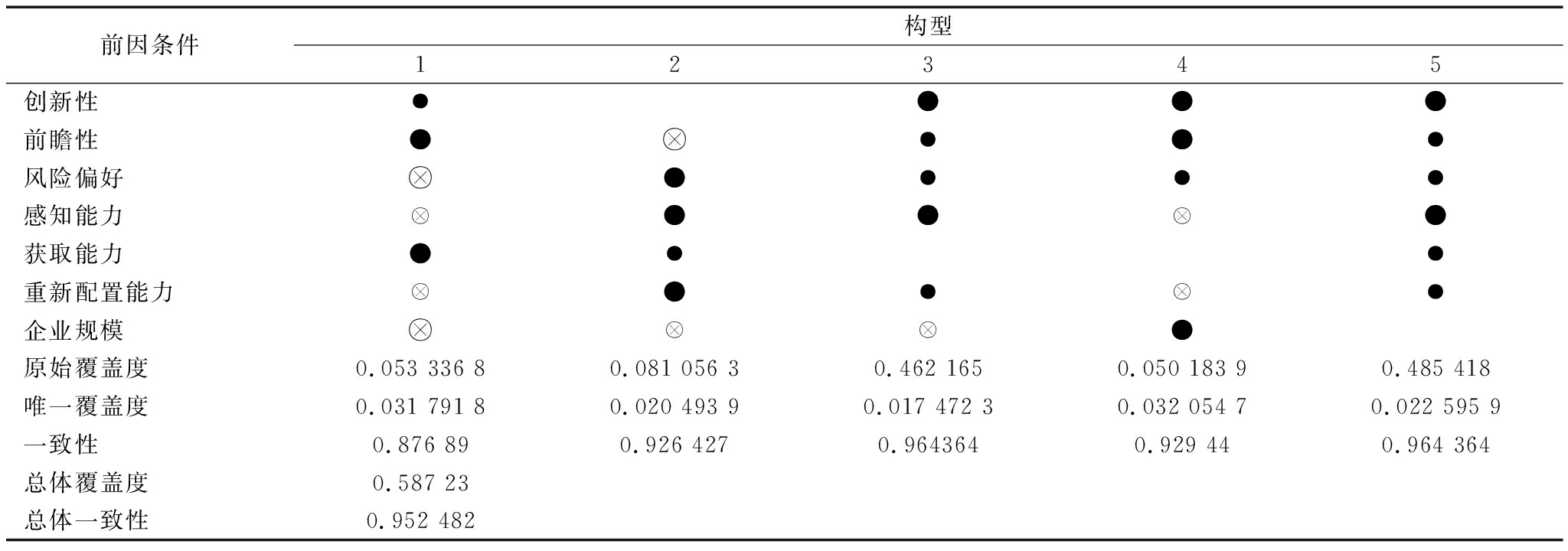 前因条件构型12345创新性●●●●前瞻性●●●●风险偏好●●●●感知能力●●●获取能力●●●重新配置能力●●●企业规模●原始覆盖度0.053 336 80.081 056 30.462 1650.050 183 90.485 418唯一覆盖度0.031 791 80.020 493 90.017 472 30.032 054 70.022 595 9一致性0.876 890.926 4270.9643640.929 440.964 364总体覆盖度0.587 23总体一致性0.952 482