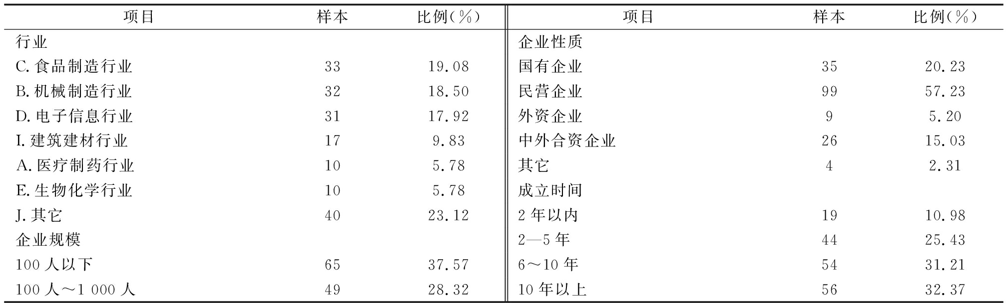 项目样本比例(%)项目样本比例(%)行业企业性质C.食品制造行业3319.08国有企业3520.23B.机械制造行业3218.50民营企业9957.23D.电子信息行业3117.92外资企业95.20I.建筑建材行业179.83中外合资企业2615.03A.医疗制药行业105.78其它42.31E.生物化学行业105.78成立时间J.其它4023.122年以内1910.98企业规模2—5年4425.43100人以下6537.576~10年5431.21100人~1 000人4928.3210年以上5632.37