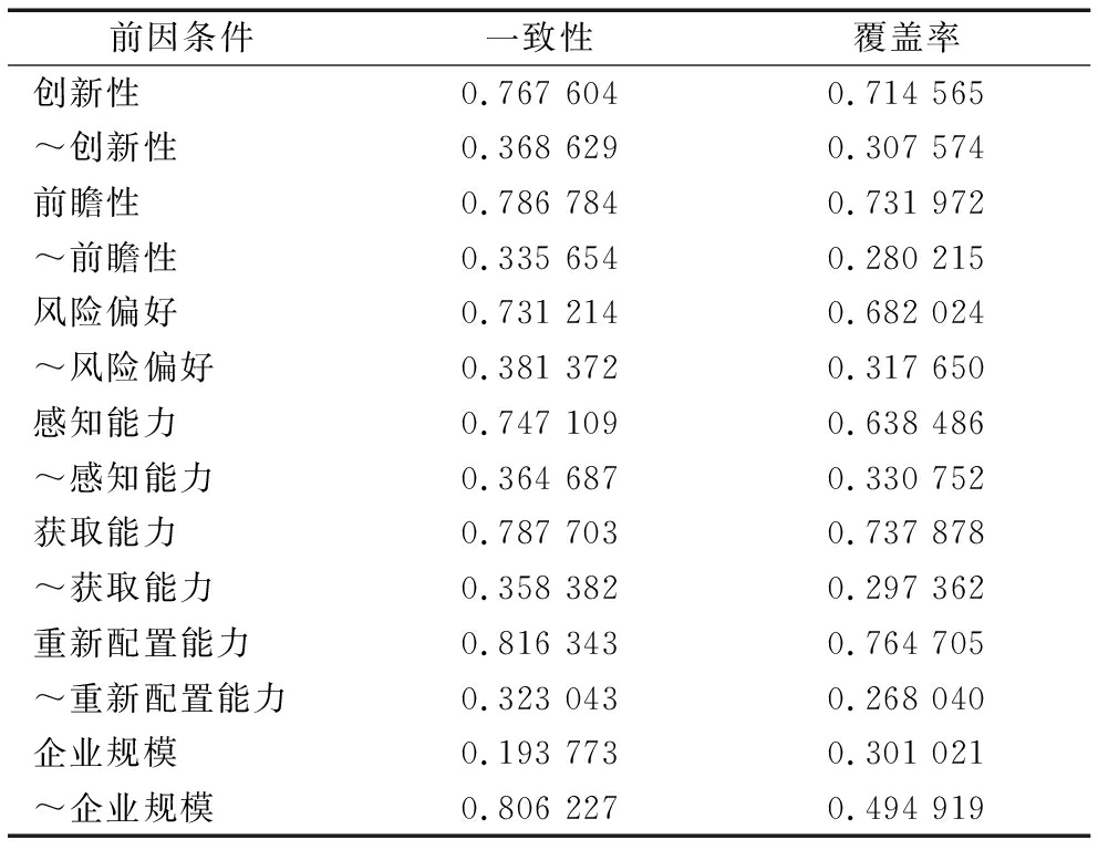 本文对前因条件(创业导向的创新性、前瞻性、风险偏好以及动态能力的感知能力、获取能力、重新配置能力)和结果(服务创新绩效)进行校准。由于受访者以制造企业中高层管理者为主,因而量表评分可能存在一定的主观性。在利用fsQCA 3.软件运算过程中,将所有变量转换为相应的模糊集隶属度,并设置3个临界值(完全不隶属、交叉点、完全隶属)。各变量锚点分别为样本的25%、均值、75%[42],校准结果见表4。采用清晰集方法对企业规模进行校准,将中小企业赋值为0,大型企业赋值为1。