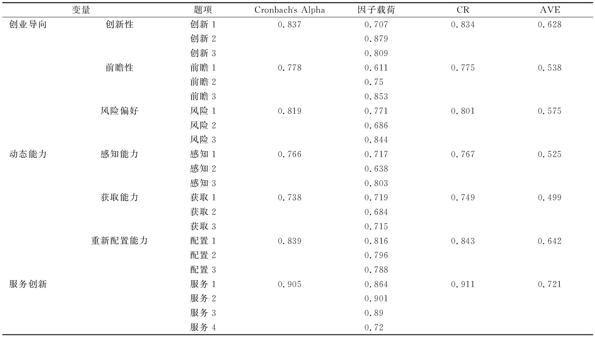 变量题项Cronbach's Alpha因子载荷CRAVE创业导向创新性创新10.8370.7070.8340.628创新20.879创新30.809前瞻性前瞻10.7780.6110.7750.538前瞻20.75前瞻30.853风险偏好风险10.8190.7710.8010.575风险20.686风险30.844动态能力感知能力感知10.7660.7170.7670.525感知20.638感知30.803获取能力获取10.7380.7190.7490.499获取20.684获取30.715重新配置能力配置10.8390.8160.8430.642配置20.796配置30.788服务创新服务10.9050.8640.9110.721服务20.901服务30.89服务40.72