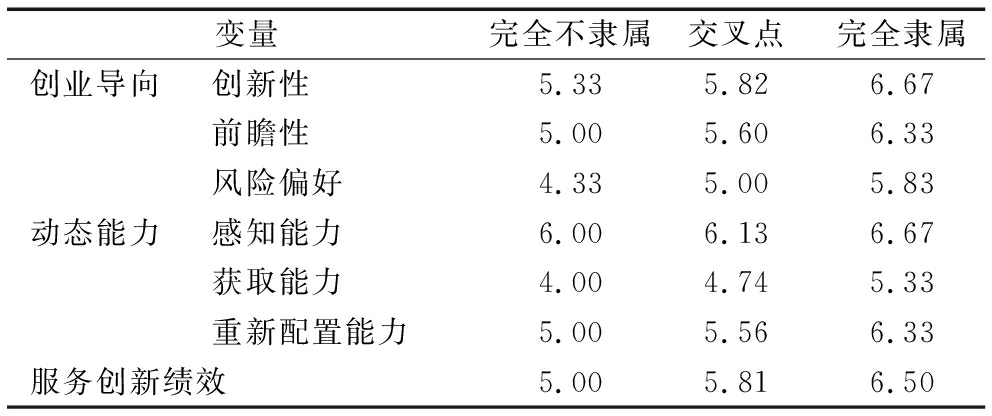 变量完全不隶属交叉点完全隶属创业导向创新性5.335.826.67前瞻性5.005.606.33风险偏好4.335.005.83动态能力感知能力6.006.136.67获取能力4.004.745.33重新配置能力5.005.566.33服务创新绩效5.005.816.50