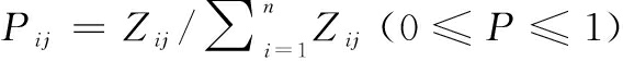 式中,Pij为标准化数据比值,ej为信息熵,dj为信息熵冗余度,Wj为指标权重。