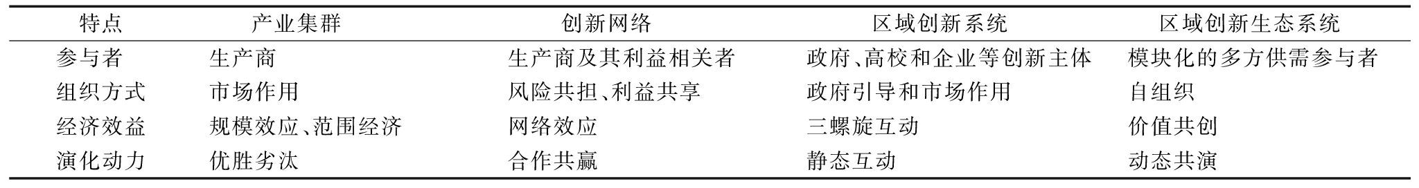 表1 产业集群、创新网络、创新系统与创新生态系统对比