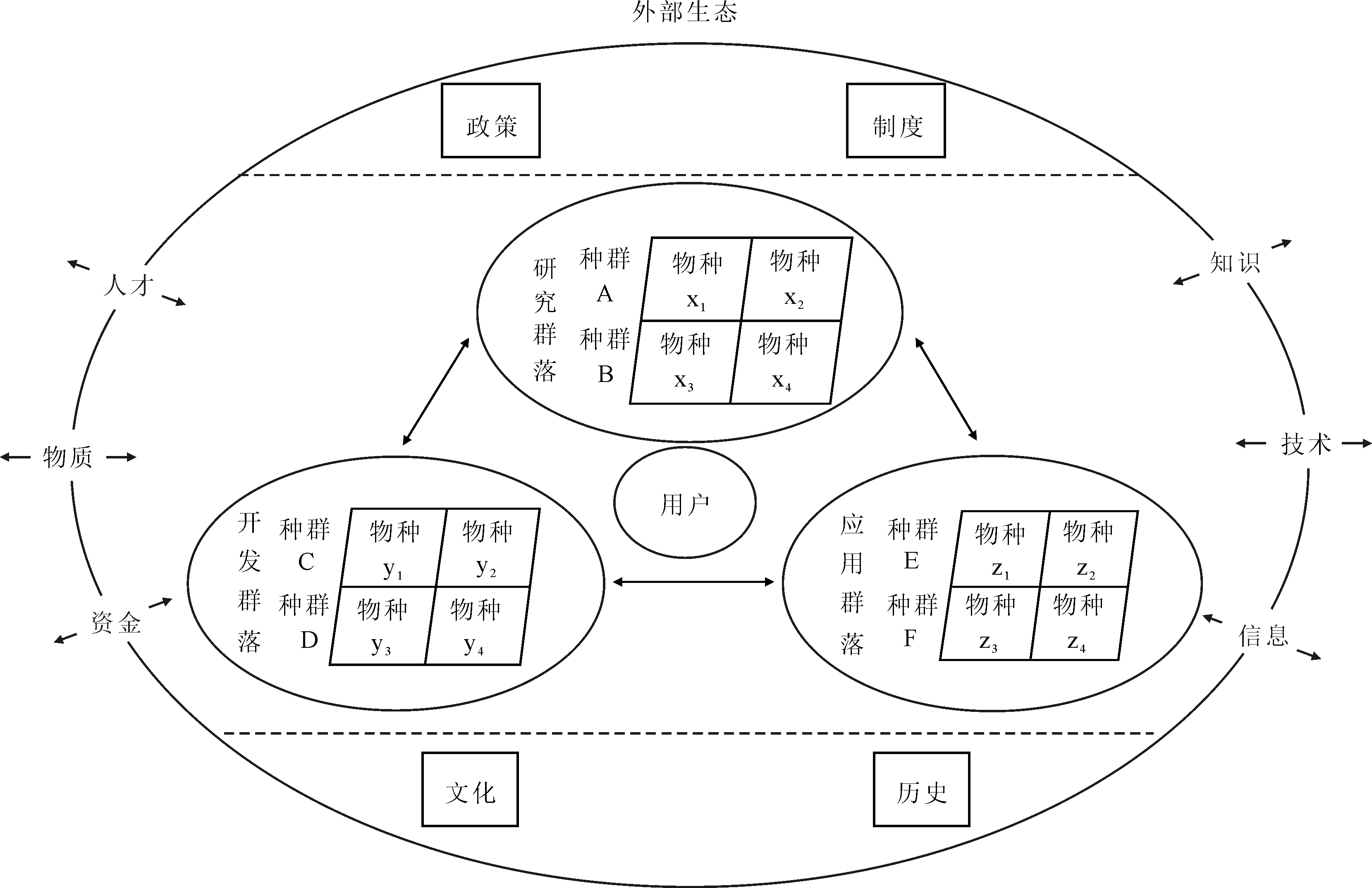 图2展示了区域创新生态系统结构,区域创新生态系统研究、开发和应用三大群落以用户为中心,通过相互作用、有机融合实现动态演化,三大群落嵌入到区域政策、制度、文化和历史等生态环境中,整个区域创新生态系统与外部生态系统之间进行知识、技术、信息和人才等创新要素交换。