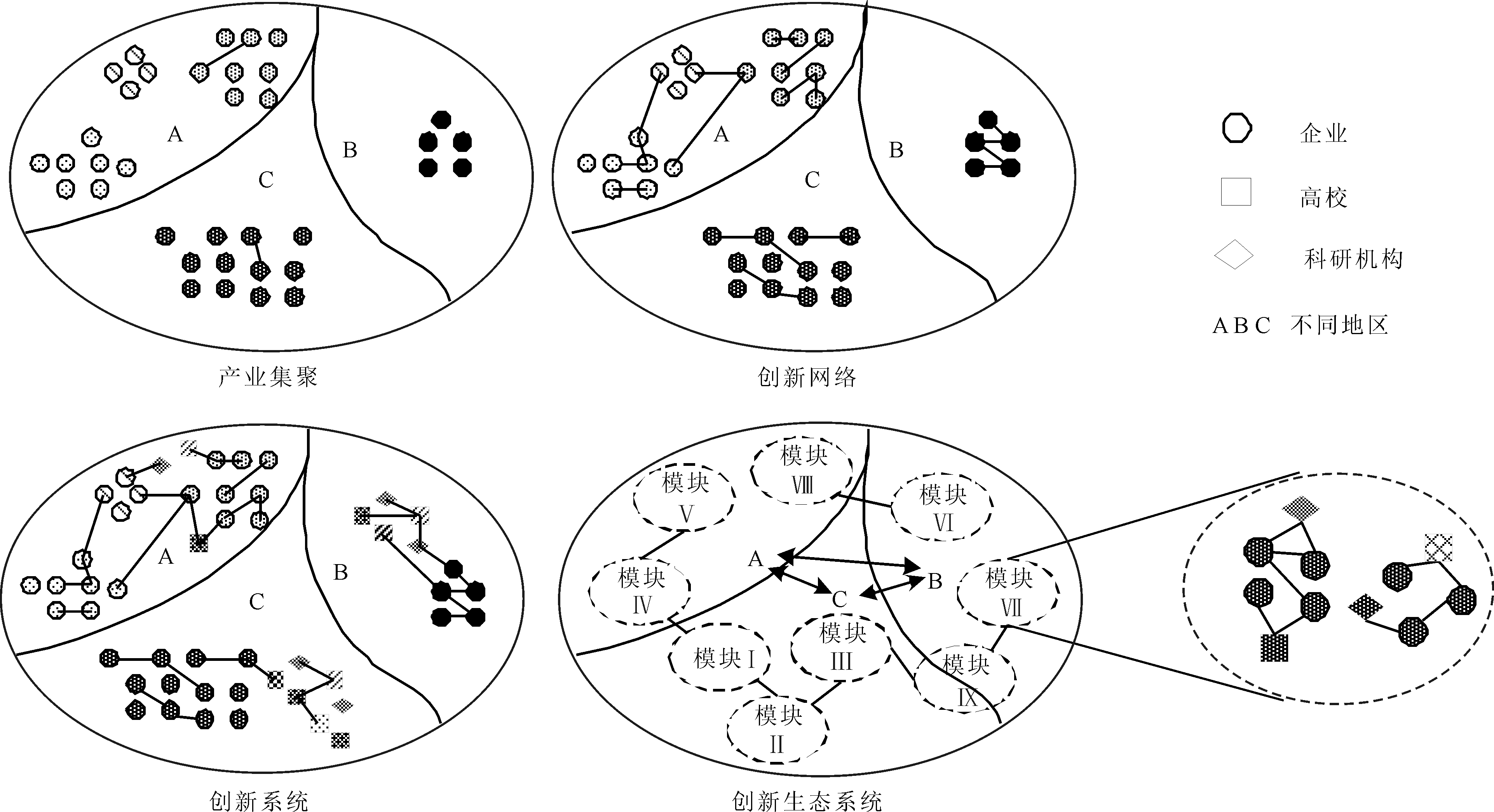 图1展示了区域创新理论演化过程中各创新主体间的互动关系。其中,产业集聚表现为同类企业之间的集聚,企业间联系较少;区域创新网络表现为更多企业间的互动,这种互动主要在企业之间呈现。区域创新生态系统是指不同创新主体根据功能和分工形成模块化群落,群落之间通过相互作用与外部保持物质能量交换。