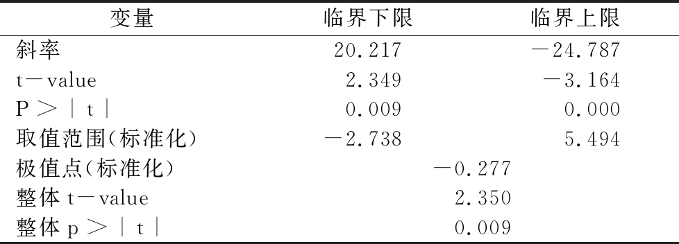 变量临界下限临界上限斜率20.217-24.787t-value2.349-3.164P > | t |0.0090.000取值范围(标准化)-2.7385.494极值点(标准化)-0.277整体t-value2.350整体p > | t |0.009