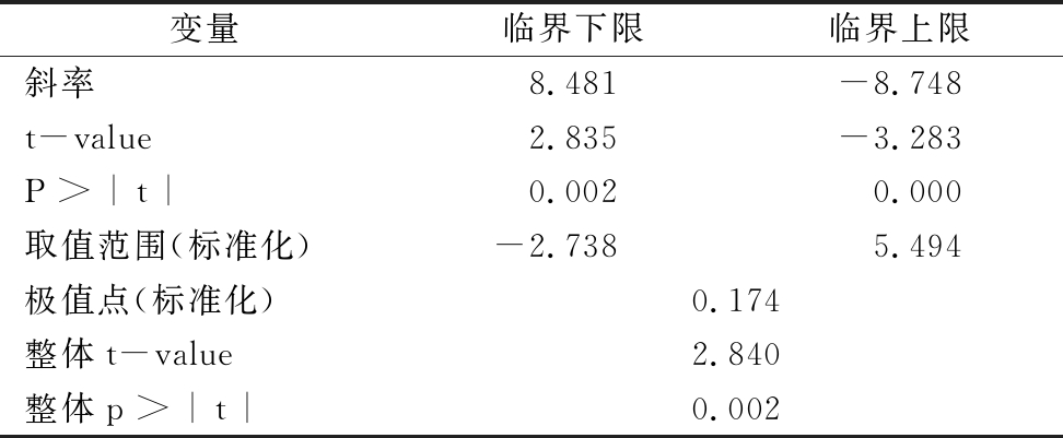 变量临界下限临界上限斜率8.481-8.748t-value2.835-3.283P > | t |0.0020.000取值范围(标准化)-2.7385.494极值点(标准化)0.174整体t-value2.840整体p > | t |0.002