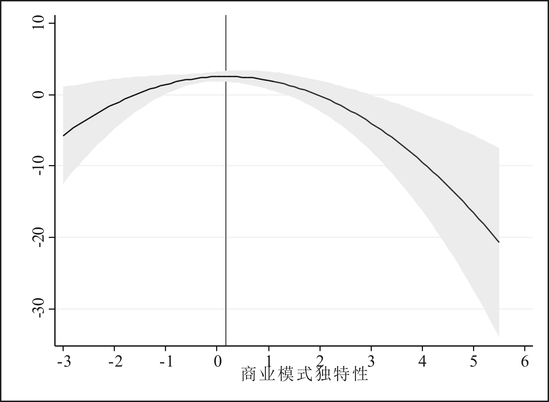 表3模型1为仅包含控制变量的基准模型,模型2回归分析结果显示,商业模式独特性的二次项与企业绩效间的回归系数显著为负(β=-0.822, p<0.001),表明商业模式独特性与企业绩效间呈倒U型关系。然而,现有研究指出,仅通过平方项系数的显著性判断U型或倒U型关系的做法不够严谨。因此,参照Lind&Mehlum[40]的做法对上述倒U型关系作进一步验证,结果如表4所示。利用Stata中的utest命令对倒U型关系曲线两端的斜率进行验证,当自变量取范围内临界下限值时,曲线斜率显著为正(8.481, p<0.005);当自变量取范围内临界上限值时,曲线斜率显著为负(-8.748, p<0.001)。此外,利用utest检验进一步验证倒U型曲线的极值点是否在自变量取值范围内,结果表明,上述倒U型曲线的极值点为0.174,而自变量取值范围为-2.738~5.494(标准化值),即极值点处于自变量取值范围内。此外,将商业模式一次项纳入回归模型后发现,一次项系数与创业企业绩效间的回归系数并不显著(未在回归结果表格中列明)。由此可以判定,商业模式独特性与企业绩效呈显著倒U型关系,如图2所示。因此,假设H1得到验证。