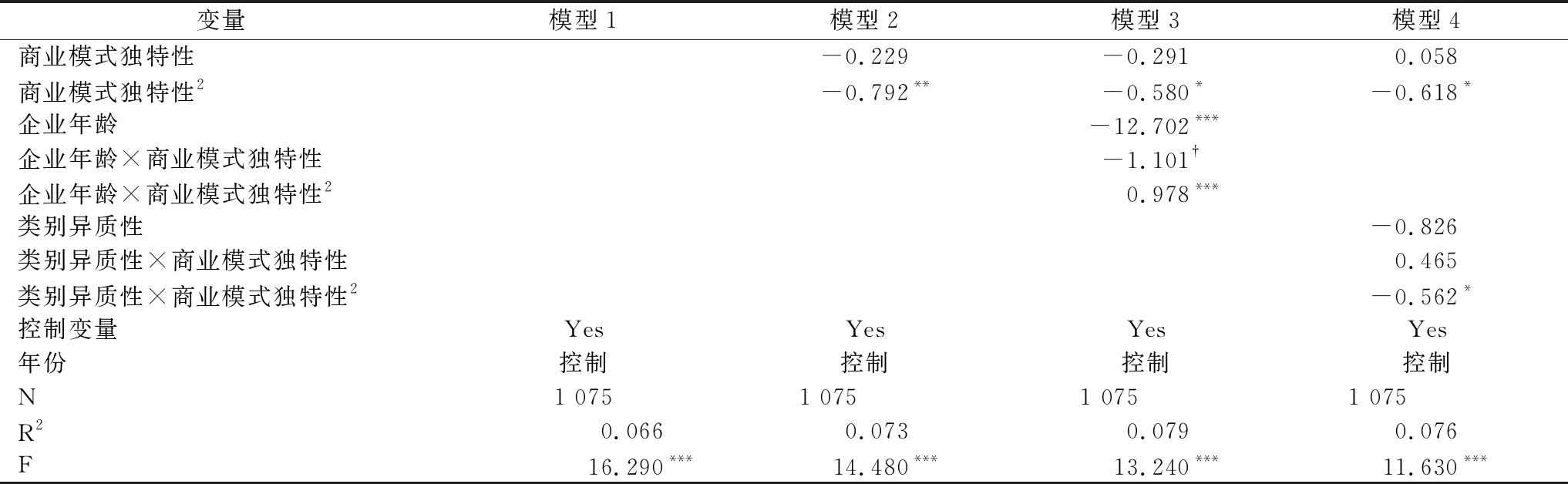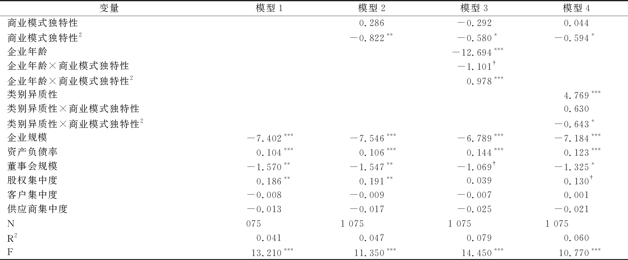 变量模型1模型2模型3模型4商业模式独特性0.286-0.2920.044商业模式独特性2-0.822**-0.580*-0.594*企业年龄-12.694***企业年龄×商业模式独特性-1.101†企业年龄×商业模式独特性20.978***类别异质性4.769***类别异质性×商业模式独特性0.630类别异质性×商业模式独特性2-0.643*企业规模-7.402***-7.546***-6.789***-7.184***资产负债率0.104***0.106***0.144***0.123***董事会规模-1.570**-1.547**-1.069†-1.325*股权集中度0.186**0.191**0.0390.130†客户集中度-0.008-0.009-0.0070.001供应商集中度-0.013-0.017-0.025-0.021N 0751 0751 0751 075R20.0410.0470.0790.060F13.210***11.350***14.450***10.770***