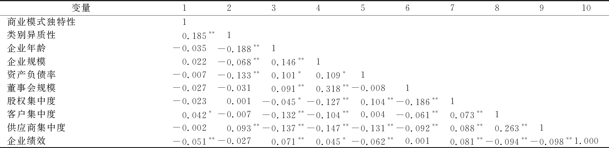 变量12345678910商业模式独特性1类别异质性0.185**1企业年龄-0.035 -0.188**1企业规模0.022 -0.068**0.146**1资产负债率-0.007 -0.133**0.101* 0.109* 1董事会规模-0.027 -0.031 0.091**0.318**-0.008 1股权集中度-0.023 0.001 -0.045* -0.127**0.104**-0.186**1客户集中度0.042* -0.007 -0.132**-0.104**0.004 -0.061**0.073**1供应商集中度-0.002 0.093**-0.137**-0.147**-0.131**-0.092**0.088**0.263**1企业绩效-0.051**-0.027 0.071**0.045* -0.062**0.001 0.081**-0.094**-0.098**1.000