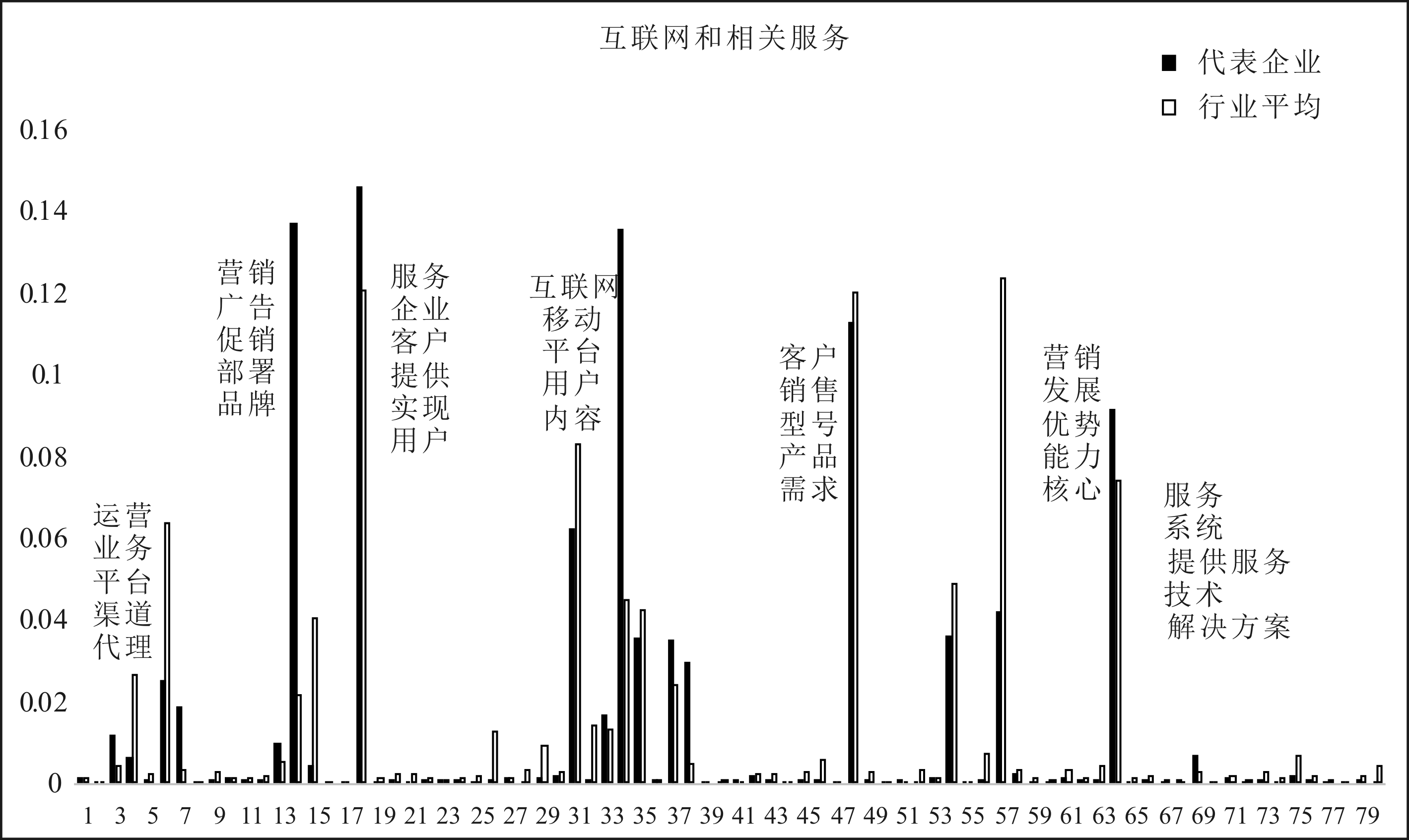 参考Haans[22]的研究成果,在分析企业商业模式时,为了更加直观地展示LDA主题模型分析结果与行业平均水平的差距,绘制图1。由图1可以看出,互联网及相关服务行业在商业模式上突出“业务、运营、平台、渠道、代理”“服务、企业、客户、提供、实现、用户”“客户、销售、型号、产品、需求”“营销、发展、优势、能力、核心”“服务、系统、提供服务、技术、解决方案”等,选取的示例企业重视“营销、广告、促销、部署、品牌”“互联网、移动、平台、用户、内容”等主题,较少关注“营销、发展、优势、能力、核心”的主题。同时,在“客户、销售、型号、产品、需求”“服务、系统、提供服务、技术、解决方案”等主题上呈现出与行业整体的相似性。