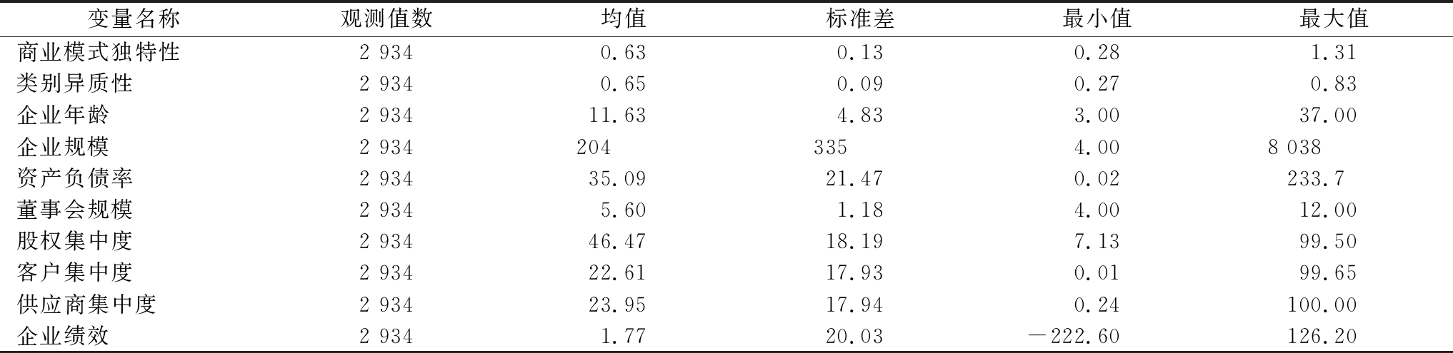 (4)控制变量。在企业基本特征方面,控制企业规模(员工人数)与资产负债率。同时,企业所有权特征与治理结构可能对组织绩效产生影响[39]。因此,在企业股权结构上,控制股权集中度(第一大股东持股比例);在企业治理结构上,控制董事会规模(董事会成员人数)。此外,客户与供应商是企业商业模式中的关键利益相关者,企业对于大客户、供应商的依赖程度可能影响其对商业模式独特性的认知与判断。例如,当企业对大客户或供应商的依赖程度较高时(客户集中度或供应商集中度较高),对焦点企业而言,每个客户或供应商的选择或决策都可能是致命的。因此,本研究控制客户集中度(第一大客户销售占比)与供应商集中度(第一大供应商供应占比)。