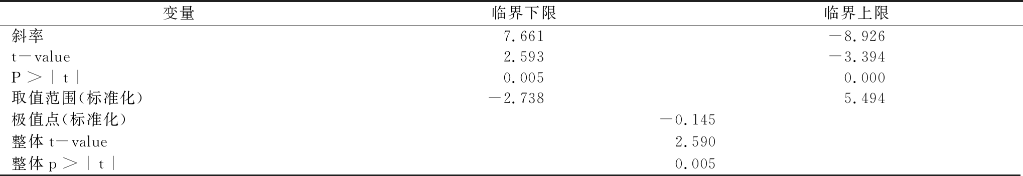 变量临界下限临界上限斜率7.661-8.926t-value2.593-3.394P > | t |0.0050.000取值范围(标准化)-2.7385.494极值点(标准化)-0.145整体t-value2.590整体p > | t |0.005
