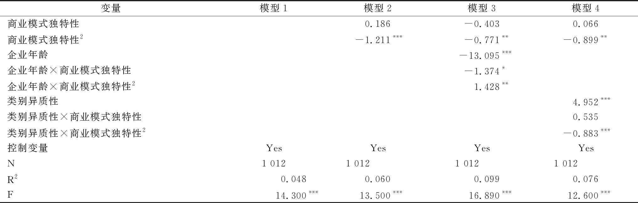 变量模型1模型2模型3模型4商业模式独特性0.186 -0.403 0.066 商业模式独特性2-1.211***-0.771**-0.899**企业年龄-13.095***企业年龄×商业模式独特性-1.374*企业年龄×商业模式独特性21.428**类别异质性4.952***类别异质性×商业模式独特性0.535 类别异质性×商业模式独特性2-0.883***控制变量Yes Yes Yes Yes N1 012 1 012 1 012 1 012 R20.048 0.060 0.099 0.076 F14.300***13.500***16.890***12.600***