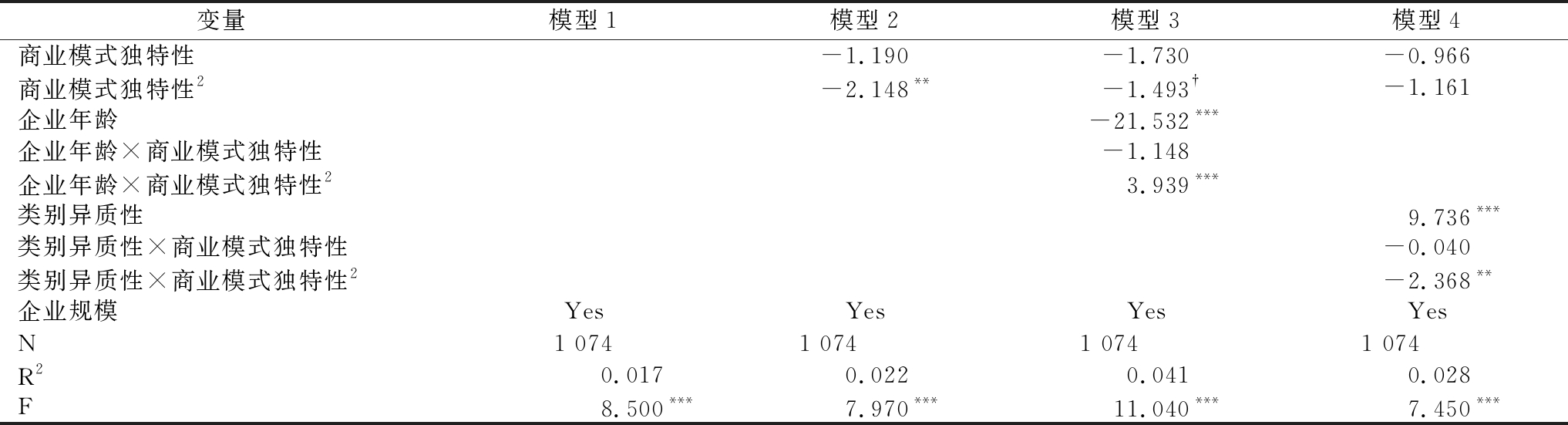 变量模型1模型2模型3模型4商业模式独特性-1.190 -1.730 -0.966 商业模式独特性2-2.148** -1.493† -1.161 企业年龄-21.532***企业年龄×商业模式独特性-1.148 企业年龄×商业模式独特性23.939***类别异质性9.736***类别异质性×商业模式独特性-0.040 类别异质性×商业模式独特性2-2.368**企业规模Yes Yes Yes Yes N1 074 1 074 1 074 1 074 R20.017 0.022 0.041 0.028 F8.500***7.970***11.040***7.450***