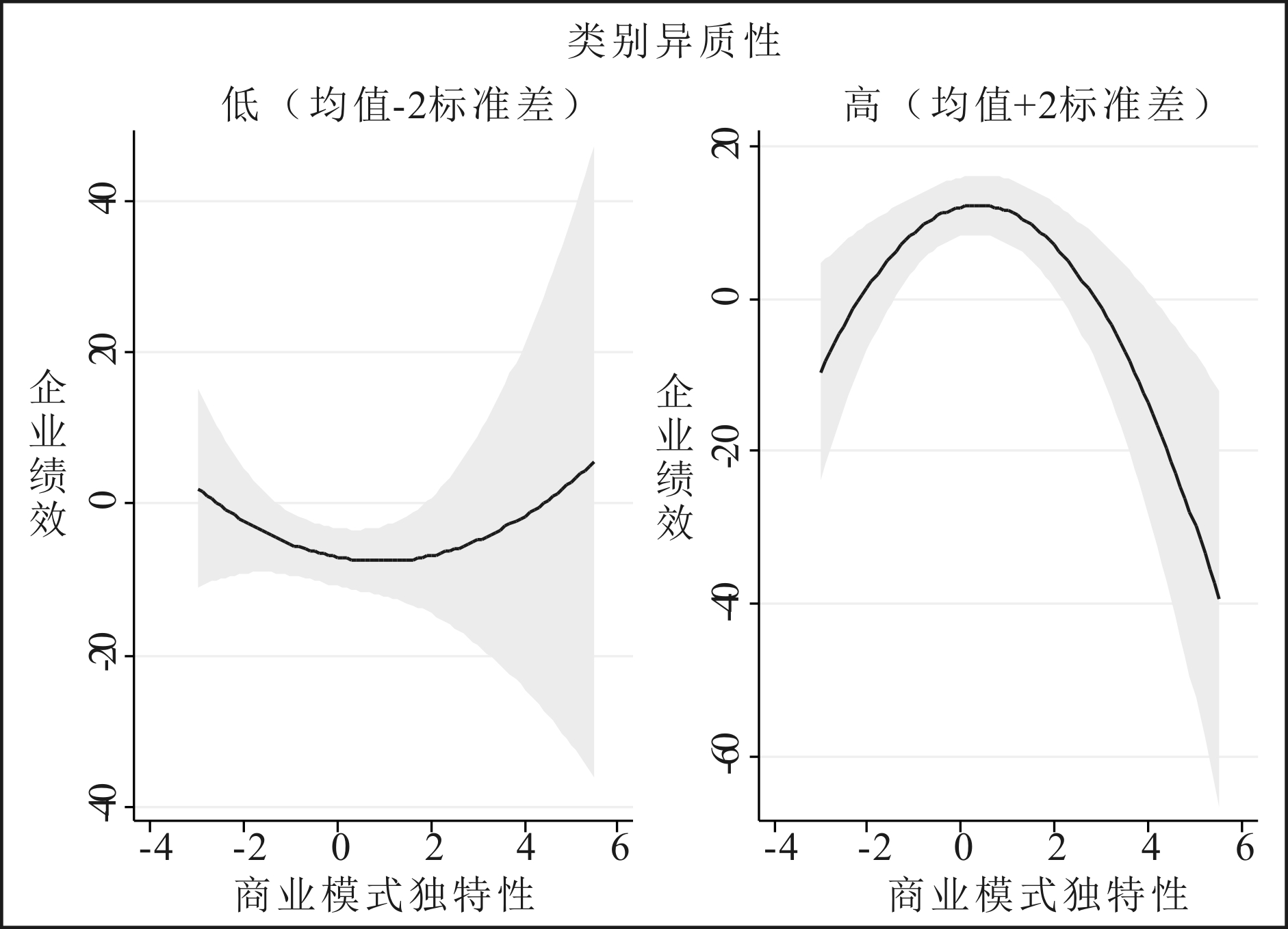 表3模型4检验类别异质性对商业模式独特性与企业绩效关系的调节作用。回归结果显示,商业模式独特性的二次项与类别异质性的交互项系数显著为负(β=-0.643, p<0.050),说明类别异质性能够强化商业模式独特性与企业绩效间的倒U型关系。为了直观展示类别异质性的调节作用,绘制类别异质性的调节效应图。图4显示,当类别异质性从低到高变化时,商业模式独特性与企业绩效间的倒U型关系得以强化,即倒U型曲线变得更加陡峭。因此,H3得到验证。