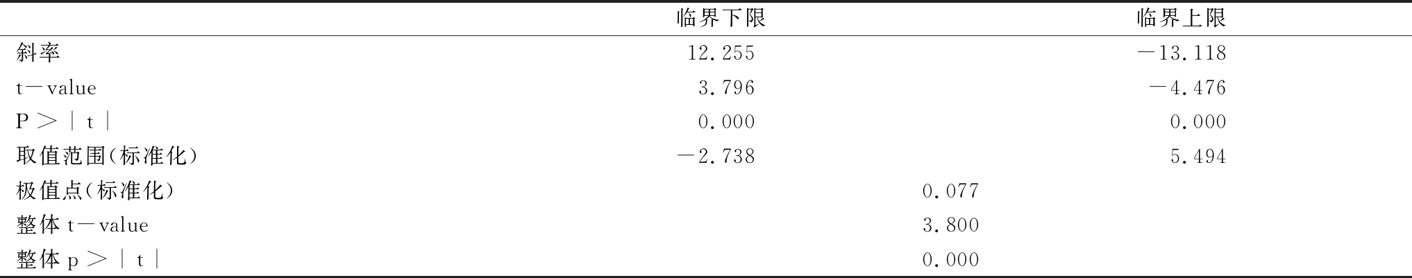 临界下限临界上限斜率12.255-13.118t-value3.796-4.476P > | t |0.0000.000取值范围(标准化)-2.7385.494极值点(标准化)0.077整体t-value3.800整体p > | t |0.000