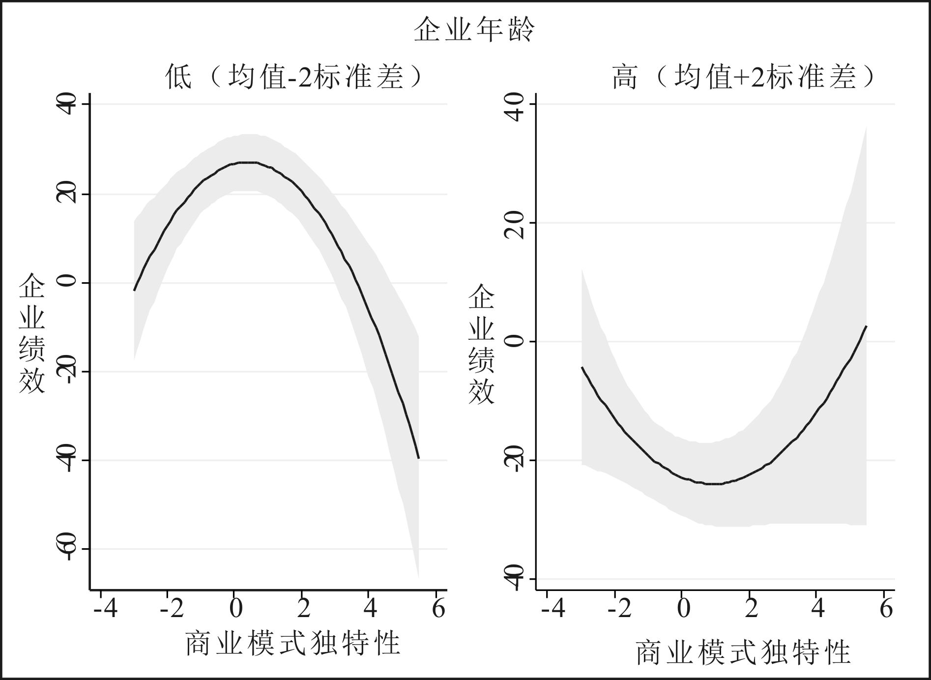 (2)企业年龄能够弱化商业模式独特性与创业企业绩效的倒U型关系,即随着企业年龄增长,该U型曲线变得平缓,表明对于新创企业而言,商业模式独特性面临的最优区分挑战更为严峻。