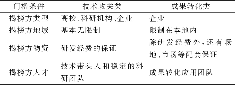 门槛条件技术攻关类成果转化类揭榜方类型高校、科研机构、企业企业揭榜方地域基本无限制限制在本地内揭榜方物资研发经费的保证除研发经费外,还有场地、市场等配套保证揭榜方人才技术带头人和稳定的科研团队成果转化应用团队