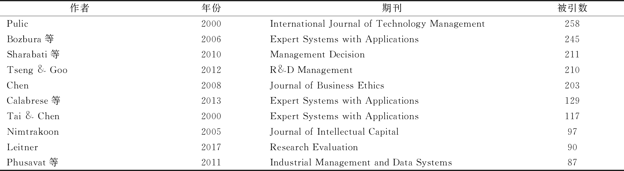 作者年份期刊被引数Pulic2000International Journal of Technology Management258Bozbura等2006Expert Systems with Applications245Sharabati等2010Management Decision211Tseng & Goo2012R&D Management210Chen2008Journal of Business Ethics203Calabrese等2013Expert Systems with Applications129Tai & Chen2000Expert Systems with Applications117Nimtrakoon2005Journal of Intellectual Capital97Leitner2017Research Evaluation90Phusavat等2011Industrial Management and Data Systems87